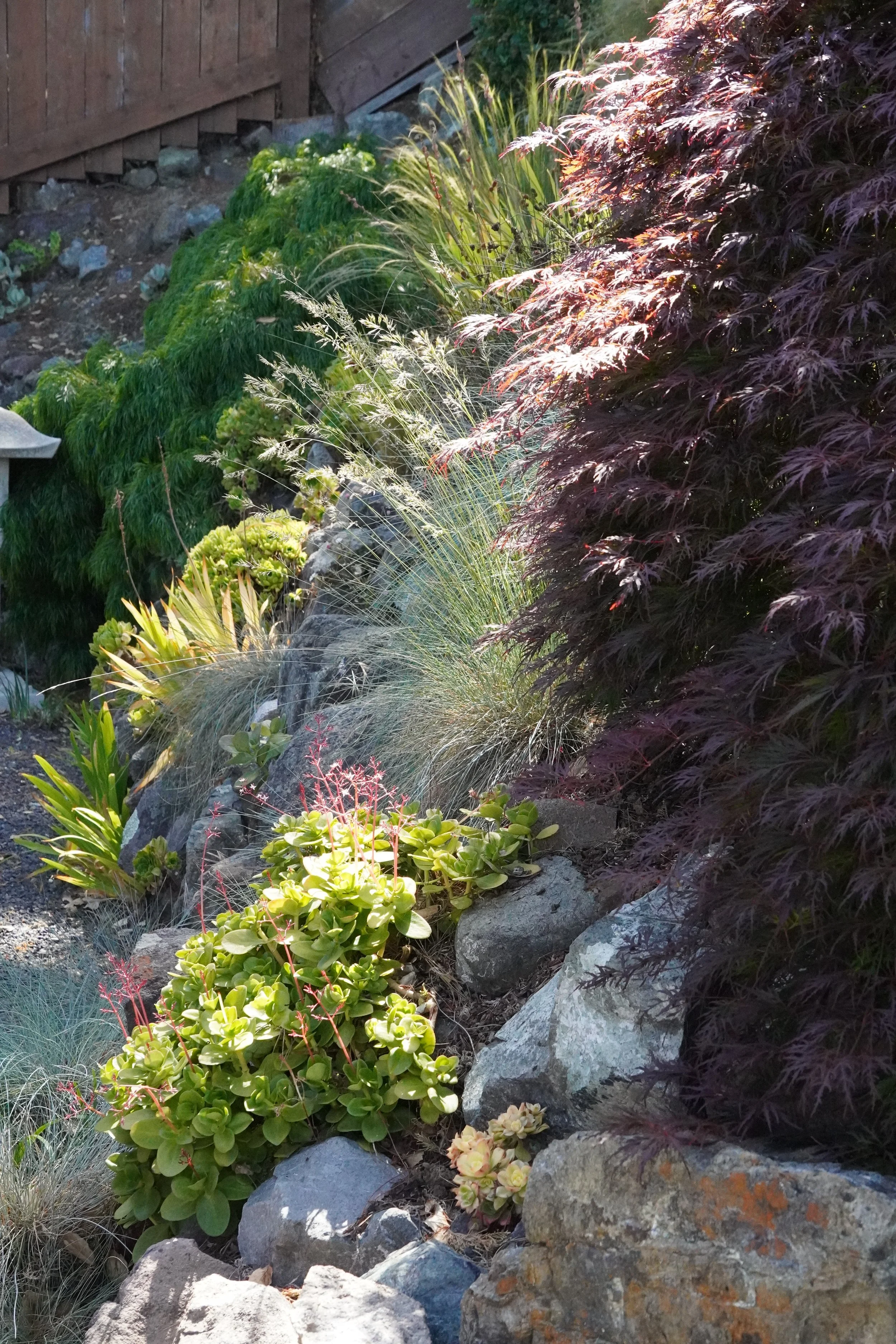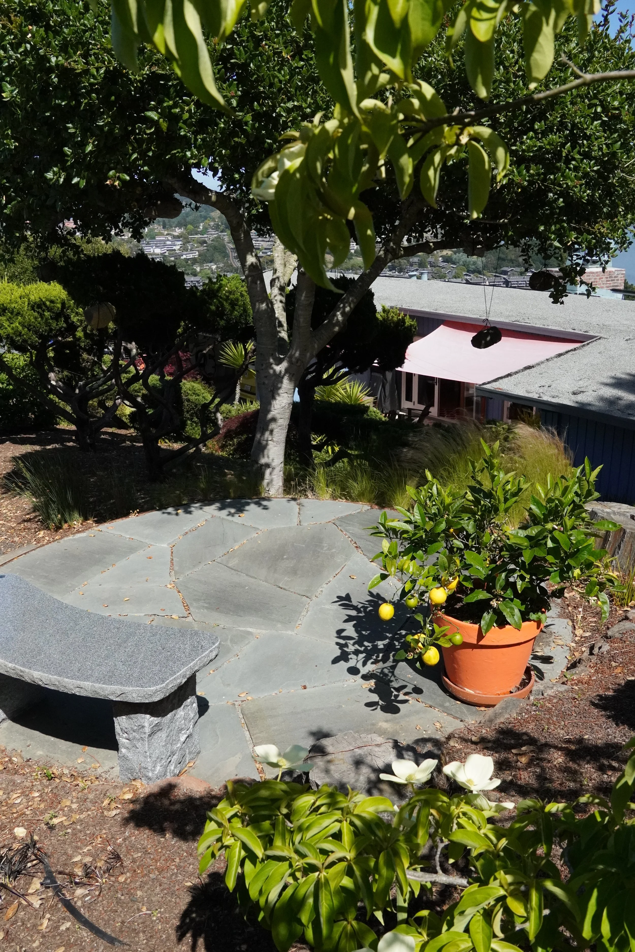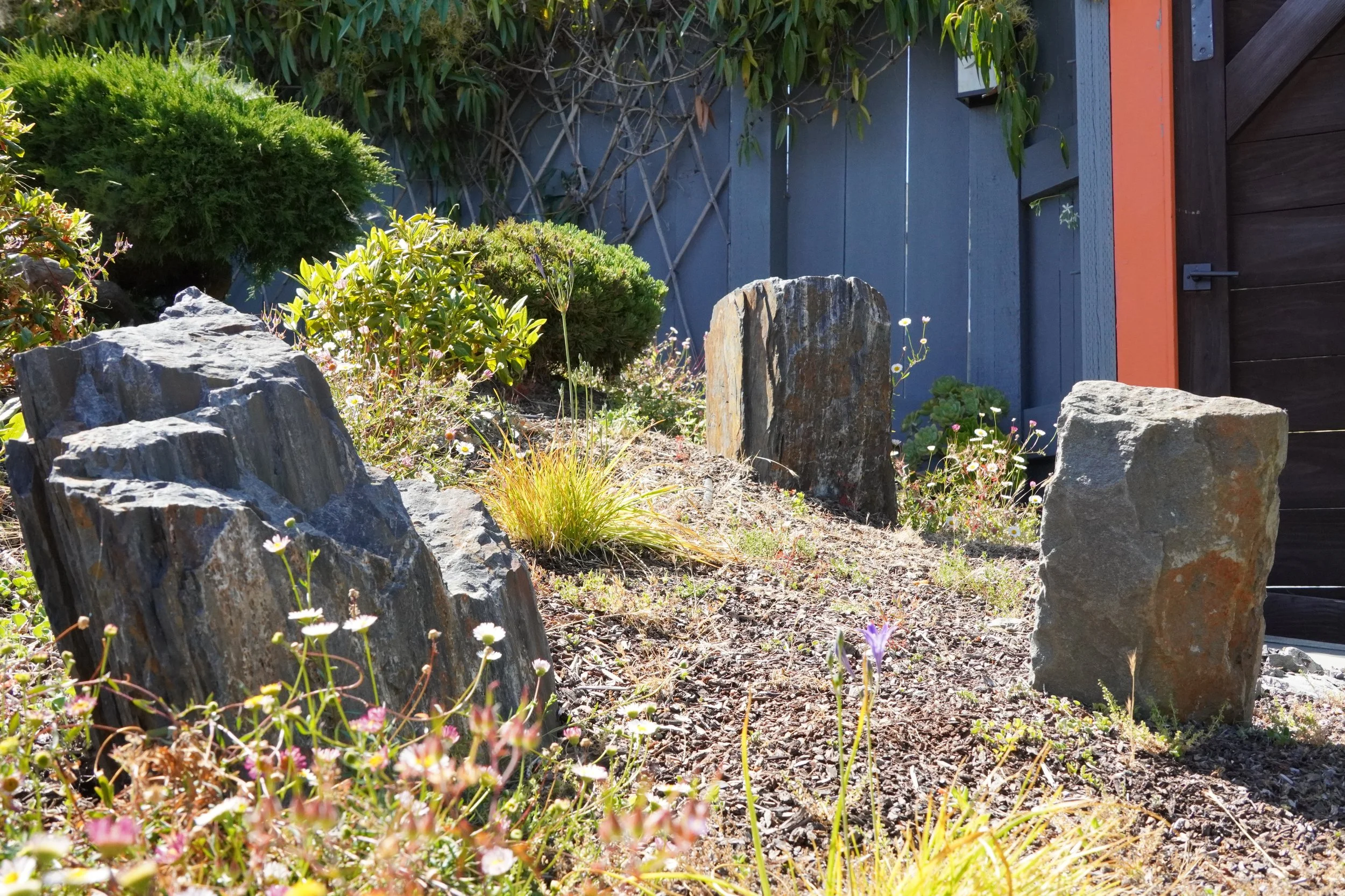 Outdoor deck space with flagstone patio, stone retaining wall, native slope planting and firepit feature.