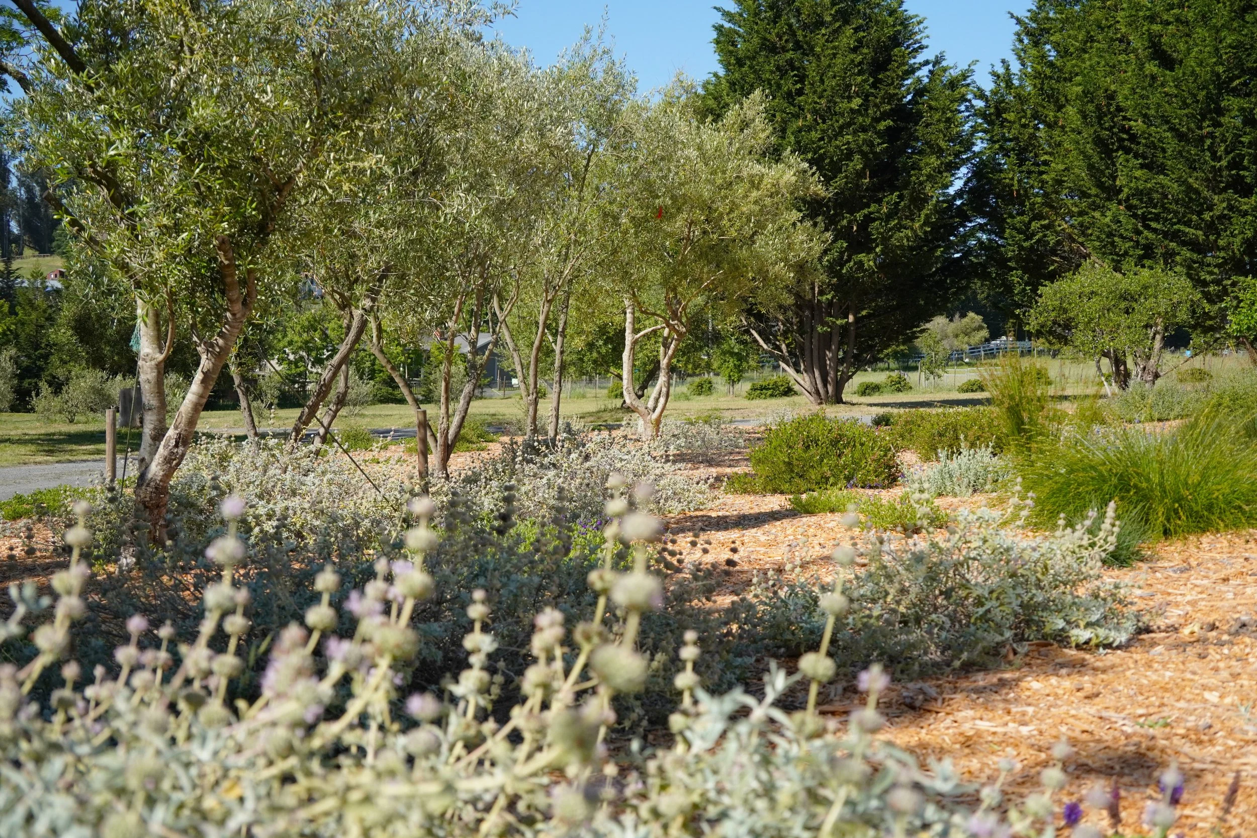 Medicinal garden installed with beautiful stone archway and seat walls, boulder water feature and rain garden.