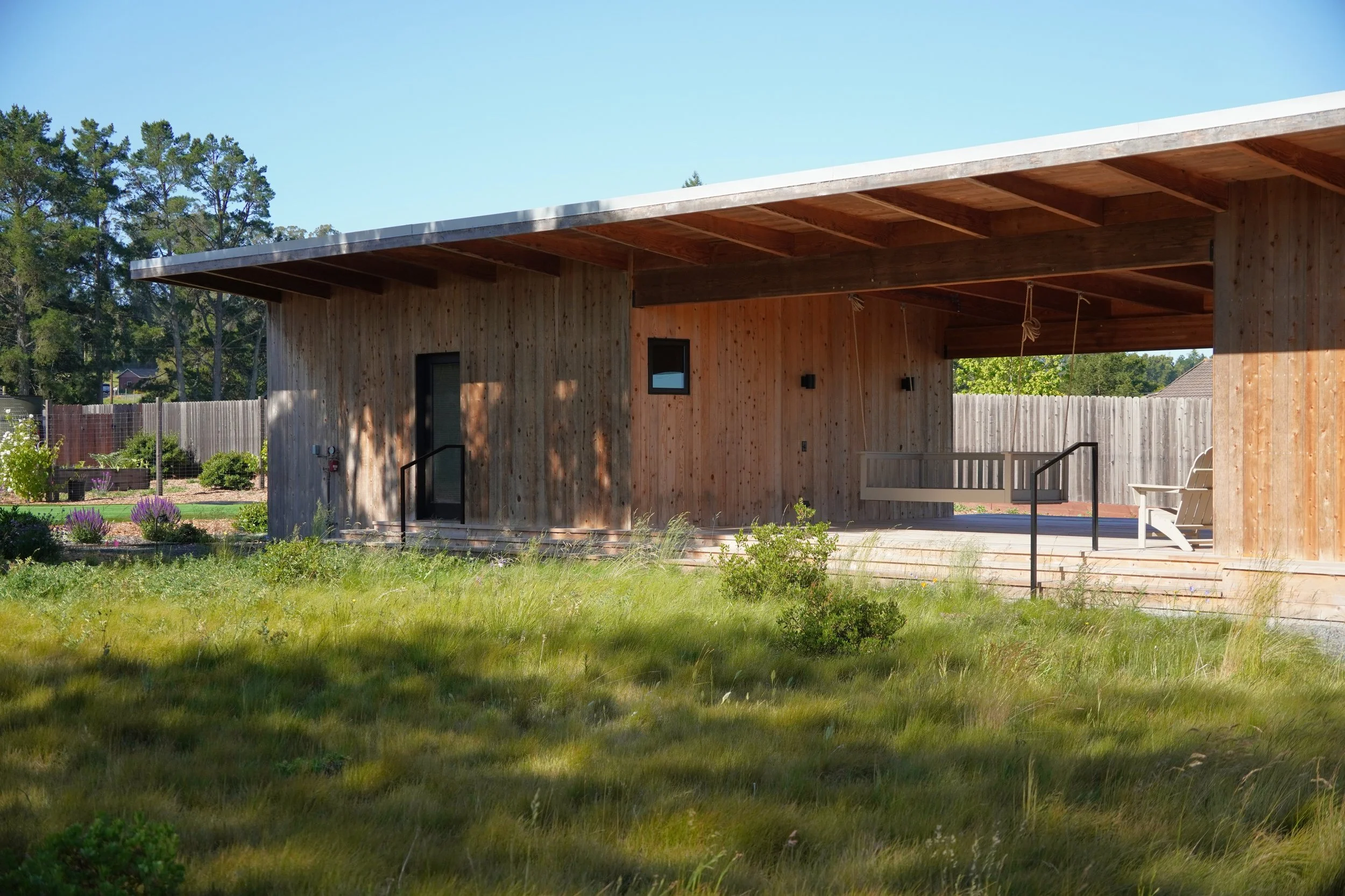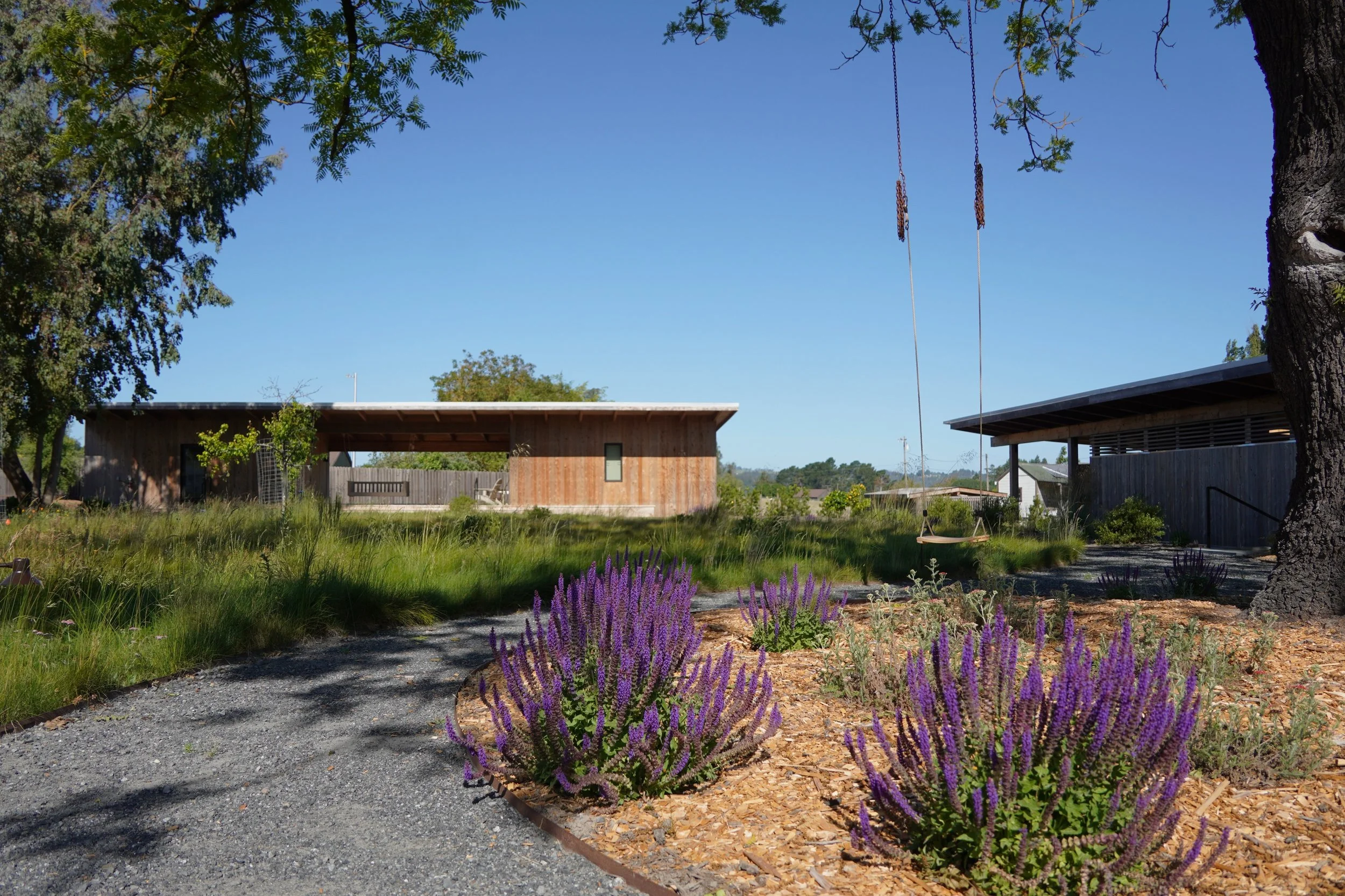 This productive landscape provides a variety of relaxing shady hang-out spots, while discreetly recharging groundwater with a series of swales and rain gardens. Complete with on-site composting and drought-tolerant, native plantings.