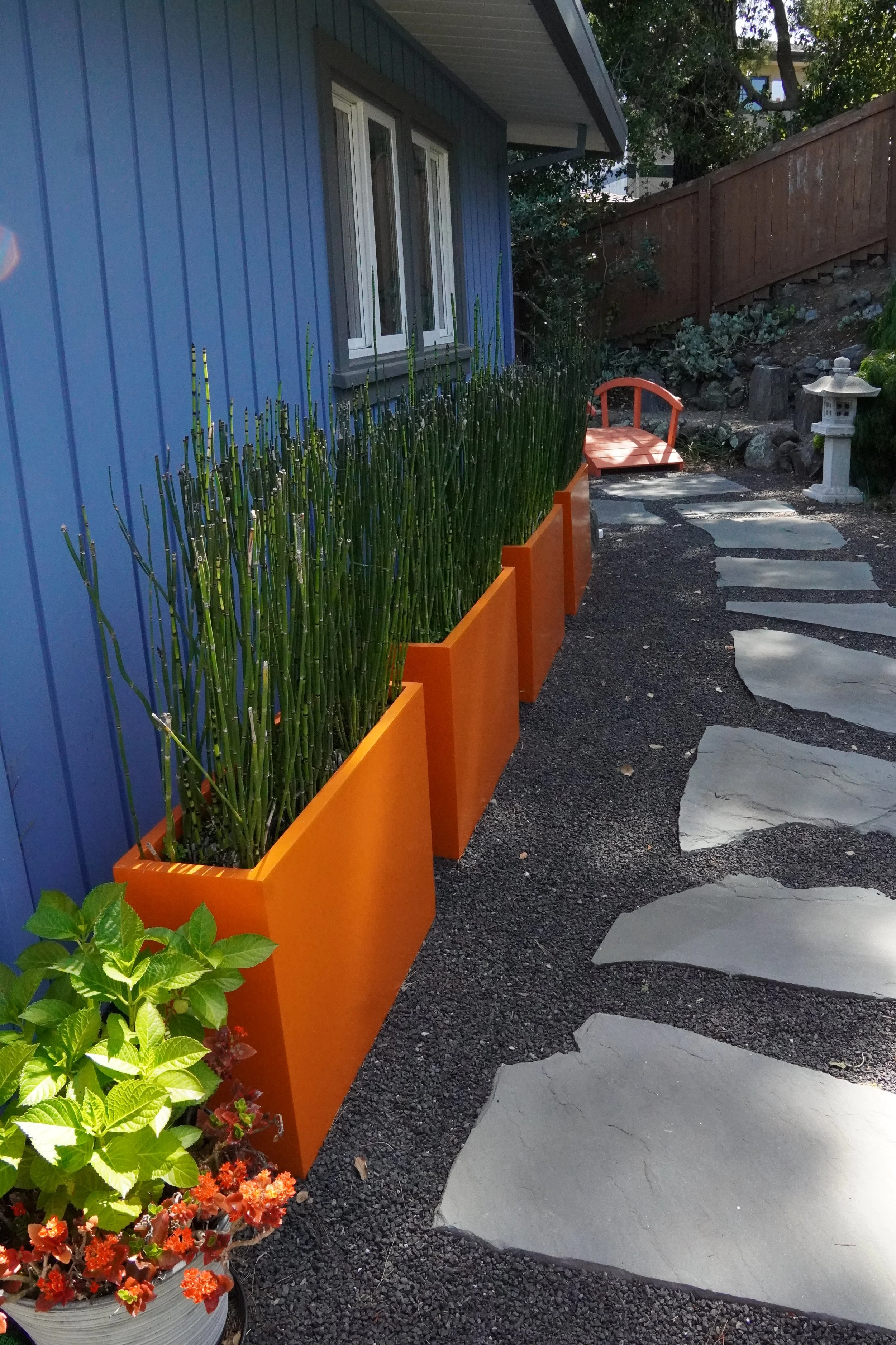 Removal of lawn to be replaced by mowable meadow - complete with waterfall pond feature, galvanized beds, and custom fence with decorative panels.